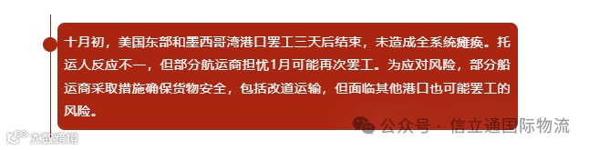 十月初,美国东部和墨西哥湾沿岸港口的罢工在持续三天后宣告结束,这一结果让业界普遍松了一口气。尽管萨凡纳等受影响港口仍需一段时间来清理拥堵,但此次罢工并未如人们普遍担忧的那样导致全系统瘫痪。