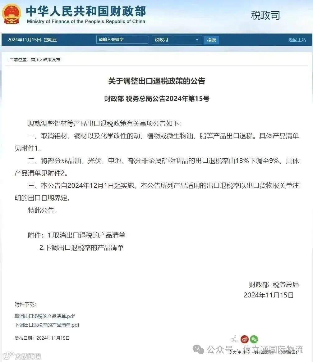 在全球经济复苏缓慢、国际贸易摩擦加剧的背景下,我国出口贸易正面临前所未有的挑战。为了应对这一局势,财政部与税务总局于2024年11月15日联合发布了《关于调整出口退税政策的公告》(财政部 税务总局公告2024年第15号),对出口退税政策进行了重大调整。