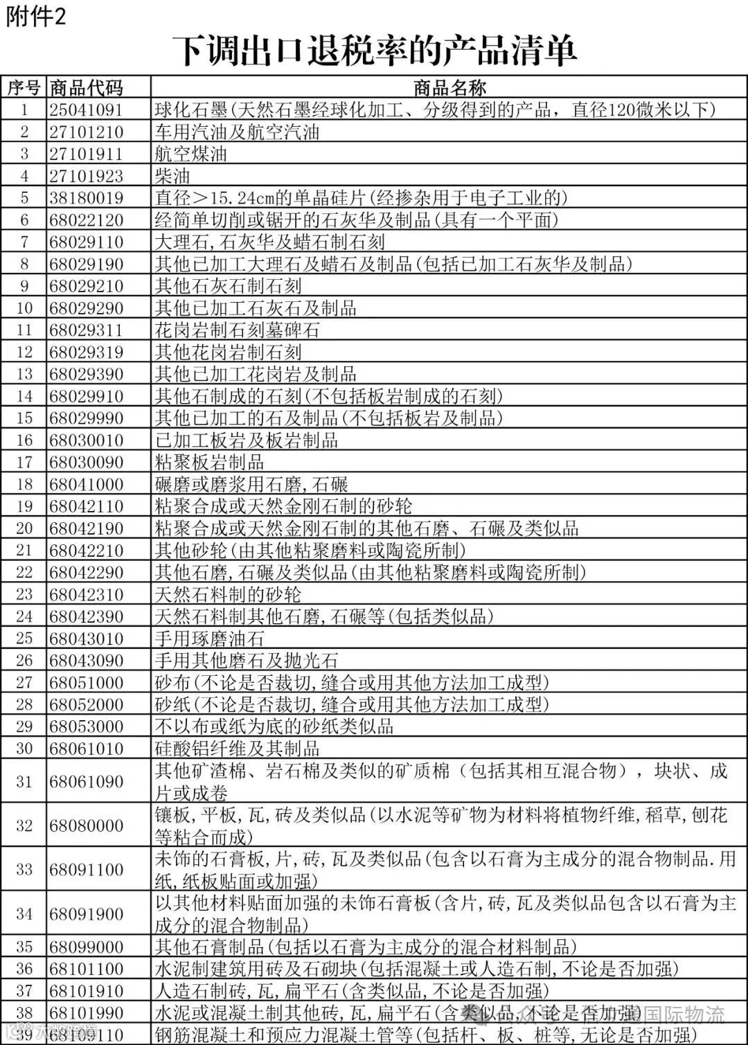 二、将部分成品油、光伏、电池、部分非金属矿物制品的出口退税率由13%下调至9%。具体产品清单见附件2。