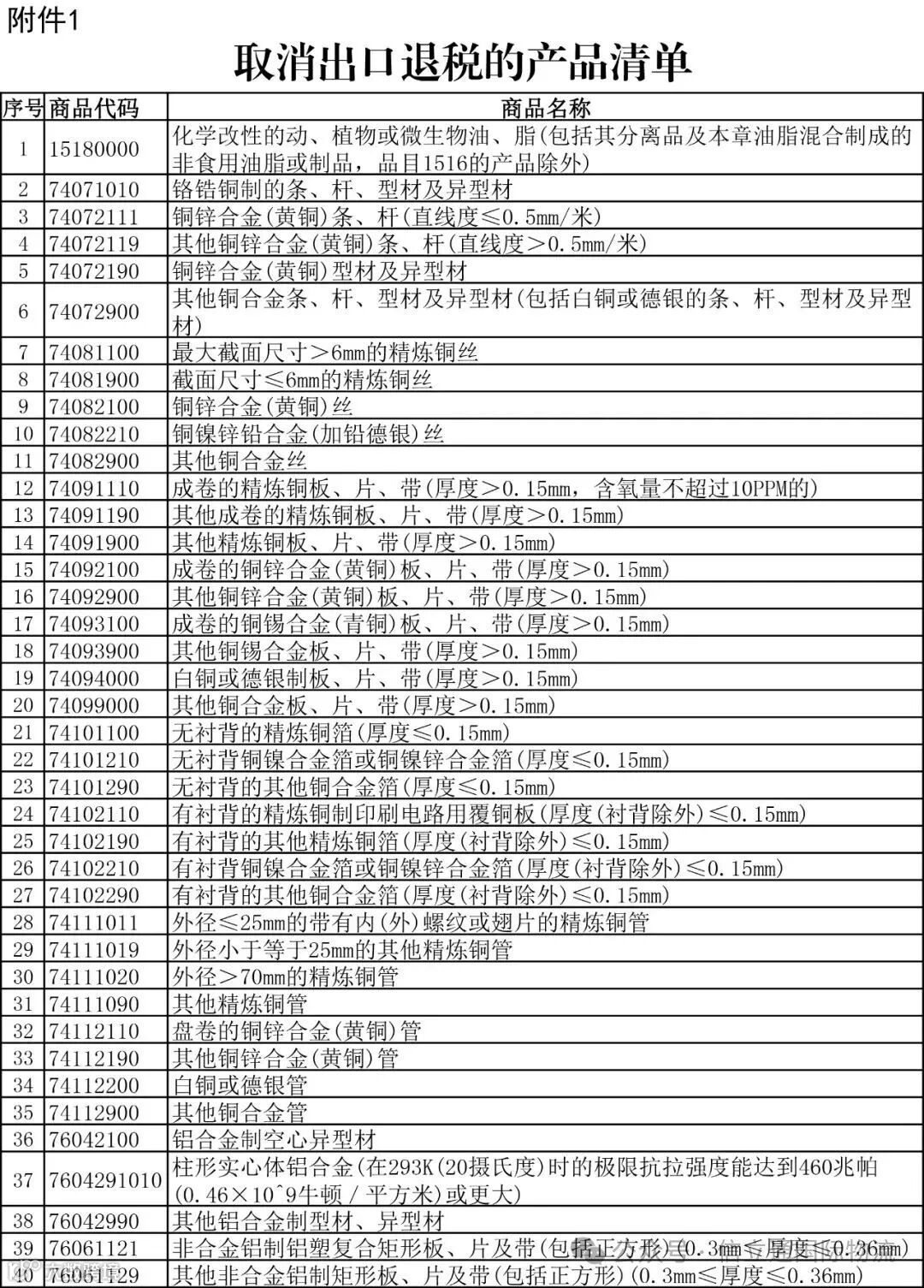一、取消铝材、铜材以及化学改性的动、植物或微生物油、脂等产品出口退税。具体产品清单见附件1。