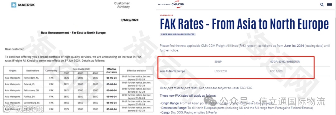 在五月已有的两轮船公司提价的基础上,“五一”假期过后,班轮公司空班恢复正常,但集装箱运输运价依然保持上涨态势。特别地是,马士基和达飞两大航运巨头已宣布6月再提价计划,即6月1日起上调北欧FAK费率。其中马士基每40尺柜最高5900美元,而达飞在15日的基础上再次上调1000美元,每40尺柜6000美元。