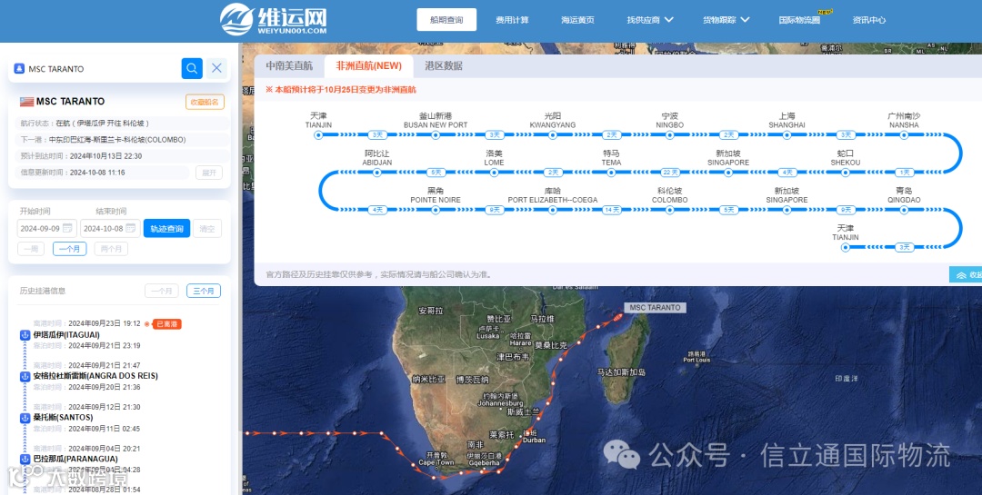 据了解,“MSC Taranto”轮建造于2011年,IMO:9475258,船长366米,型宽51米,载箱量14000TEU,悬挂利比里亚旗帜。后续该船将投入服务于MSC的南非航线AFRICA EXPRESS。10月25日宁波开航、10月26日上海开航、10月29日南沙开航、10月30日蛇口开航。
