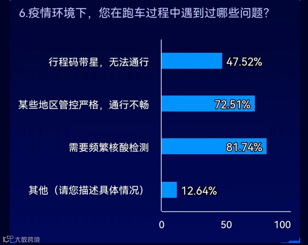 在调查报告中,有73%货车司机坚持跑车。但由于各地疫情管控措施规定,59%的司机表示频繁核酸检测是跑车过程中遇到的最大问题,46%货车司机表示,管控严格、通行不畅,28%货车司机因行程码带星、无法通行。