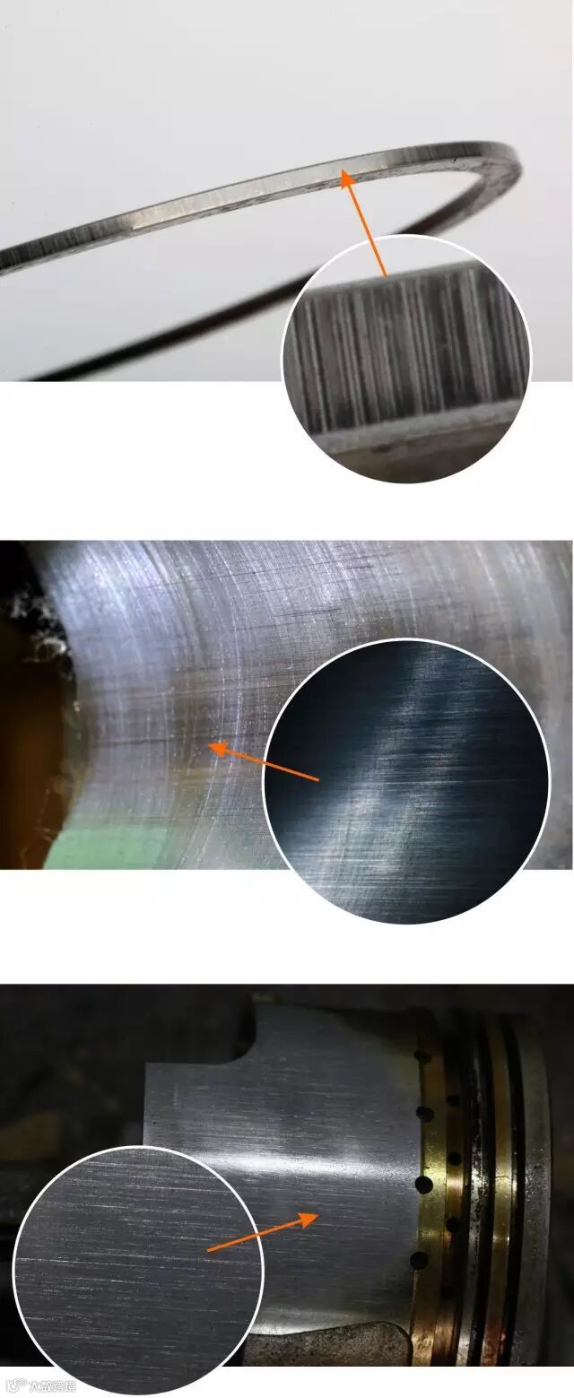 拆解发现:活塞环、气缸壁和活塞裙部有拉伤磨损现象。