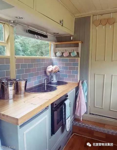 车窗被夫妻俩完整的保留,因为这样可以随时看到窗外的美景,这是车内的厨房,虽然面积不大,但是洗头台,微波炉和橱柜都应有尽有十分方便。