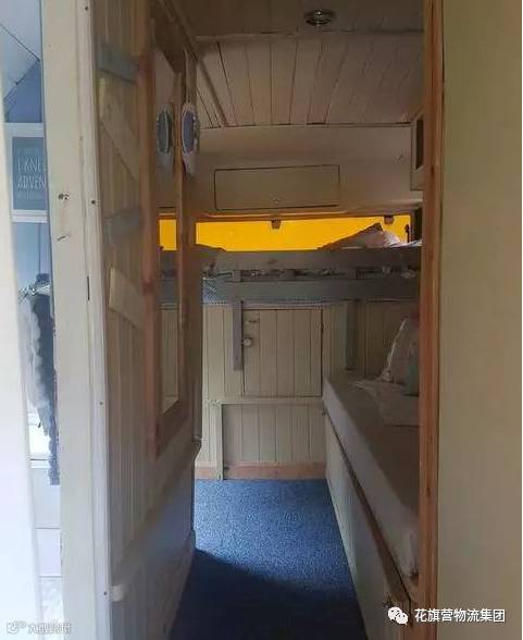 图为三个孩子们的卧室,卧室内摆放有3张木质的床,地上铺着蓝色的地毯,屋内安装着橙色的灯光,看起来非常温馨,这对夫妻对于空间的利用非常有天赋,车厢内这样狭窄的空间也被他们安排的井井有条。
