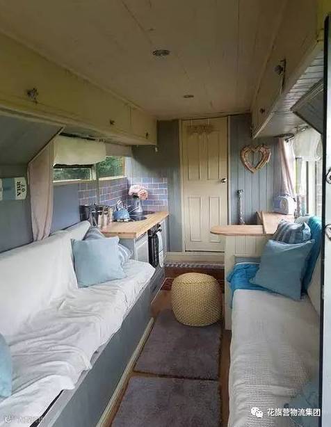 夫妻俩将公交车的外形保留,并为车换了一个颜色,车内的装置更换一新,原有的座椅换成了舒适的沙发,还在沙发前安装了一张小桌子,看起来很有生活的情调。