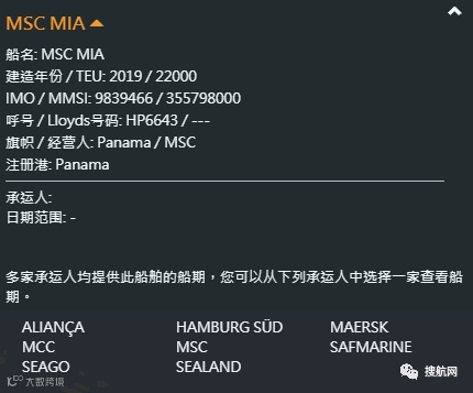 根据大船期数据显示,“MSC MIA”轮服务于亚欧航线,下一个停靠港口是意大利的焦亚陶罗港;曾挂靠国内多个港口,包括:青岛港、上海港、宁波港、厦门港、南沙新港、深圳盐田港。除了MSC涉及多家船公司共舱:ALIANÇA、HAMBURG SÜD、MAERSK、MCC、MSC、SAFMARINE、SEAGO、SEALAND。