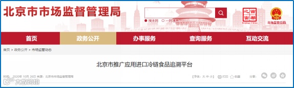 10月26日,北京市市场监督管理局发布通知称,为落实新冠肺炎疫情防控要求,进一步加强对进口冷链食品监管,北京市市场监督管理局联合北京市商务局于发布通告,推广应用“北京市冷链食品追溯平台”(下称“北京冷链”),以实现对进口冷藏冷冻肉类、水产品的追溯管理。通告要求自2020年11月1日起,北京市进口冷链食品生产经营单位均需在“北京冷链”中如实上传进口冷藏冷冻肉类、水产品来源、流向等追溯数据,落实电子追溯码赋码、贴码等。