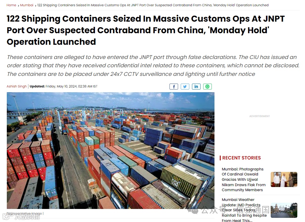 近期,印度最大港口纳瓦舍瓦港(Nhava Sheva)所在的贾瓦哈拉尔-尼赫鲁海关(JNCH)所属的海关情报部门(CIU),开展了据称该海关迄今为止最大规模的一次执法行动:查扣了多达122个来自中国的集装箱货物!