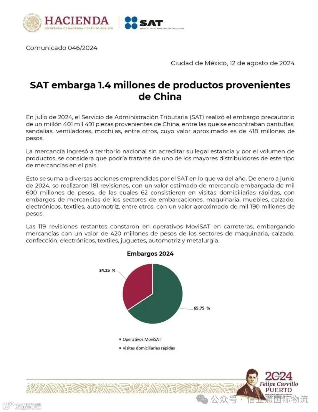 近日,墨西哥国家税务管理局(SAT)发布报告,宣布对一批总价值约4.18亿比索的中国商品实施了预防性扣押措施。