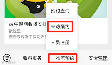 ,现推出公众号物流预约功能。请来访单位提前进行人员注册和来访预约,预约成功并到达