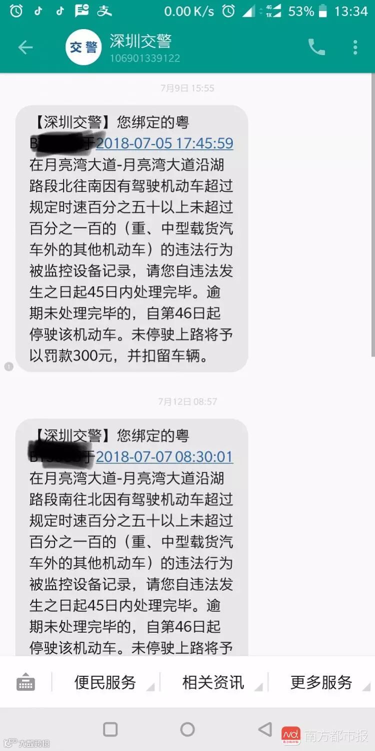 南都讯 记者陈文才 近日,深圳月亮湾片区的多名车主收到了深圳交警的违章短信通知,违章地点均位于月亮湾大道沿湖路段2处刚设置的电子测速点。众多司机中,轻者被扣6分罚款150元,重者数日内被扣24分罚款4000元。