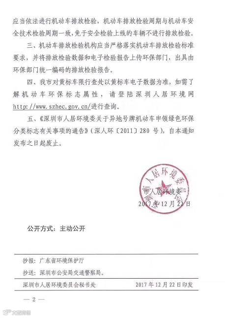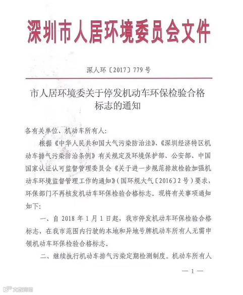 根据《中华人民共和国大气污染防治法》、《深圳经济特区机动车排气污染防治条例》有关规定及环境保护部、公安部、中国国家认可监督管理委员会《关于进一步规范排放检验加强机动车环境监督管理工作的通知》(国环规大气﹝2016﹞2号)要求,环保部门不再核发机动车环保检验合格标志。现将有关事项通知如下: