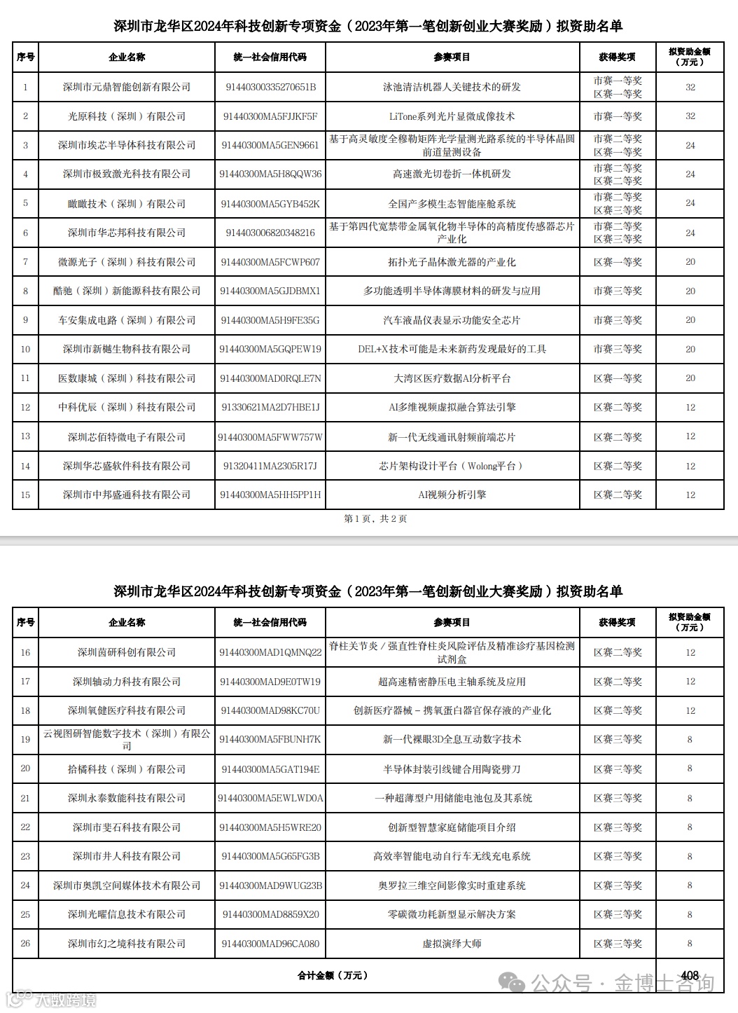 附件:1.深圳市龙华区2024年科技创新专项资金(2023年第一笔创新创业大赛奖励)拟资助名单
