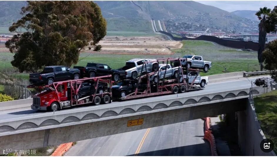 2025年4月2日,美国加利福尼亚州圣地亚哥奥泰梅萨(Otay Mesa)口岸,无人机拍摄到卡车在通过美国海关后从墨西哥蒂华纳(Tijuana)进入美国的画面。