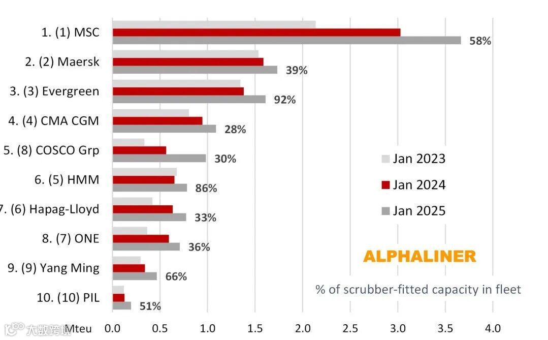 据Alphaliner称,去年,中远集团投入巨资增加洗涤器的使用量,以满足全球排放标准。安装洗涤器的船队运力位列全球前五位,船队运力所占比例达到30%左右。
