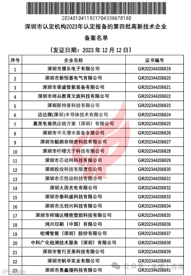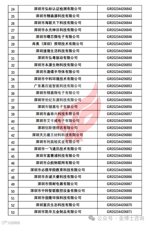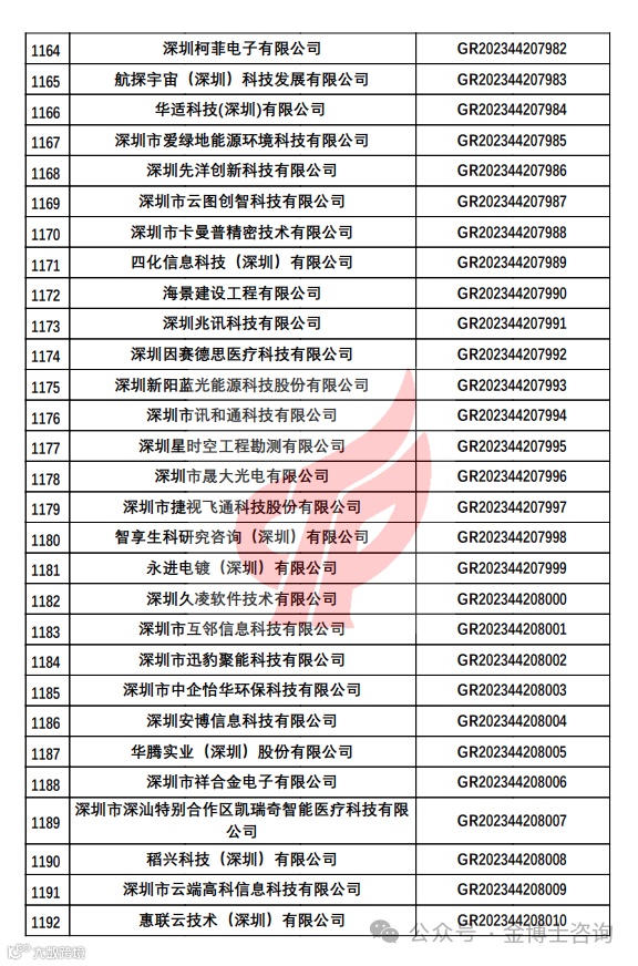 金博士咨询根据《高新技术企业认定管理办法》(国科发火〔2016〕32号)和《高新技术企业认定管理工作指引》(国科发火〔2016〕195号)有关规定,现对深圳市认定机构2023年认定报备的第四批1192家高新技术企业备案名单(详见附件)予以公告。