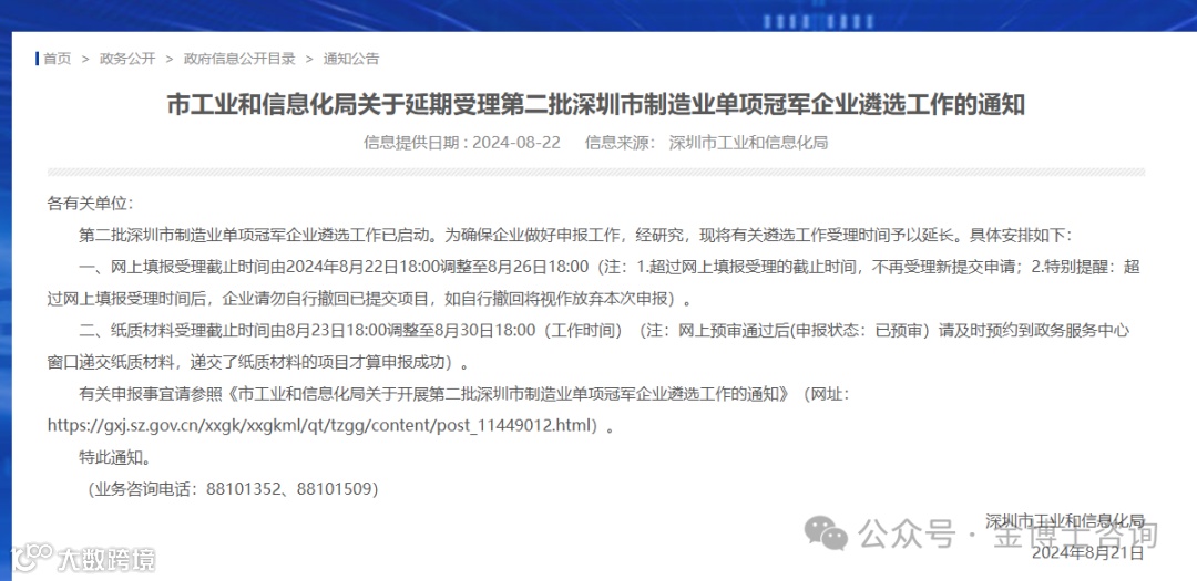 一、网上填报受理截止时间由2024年8月22日18:00调整至8月26日18:00(注:1.超过网上填报受理的截止时间,不再受理新提交申请;2.特别提醒:超过网上填报受理时间后,企业请勿自行撤回已提交项目,如自行撤回将视作放弃本次申报)。
