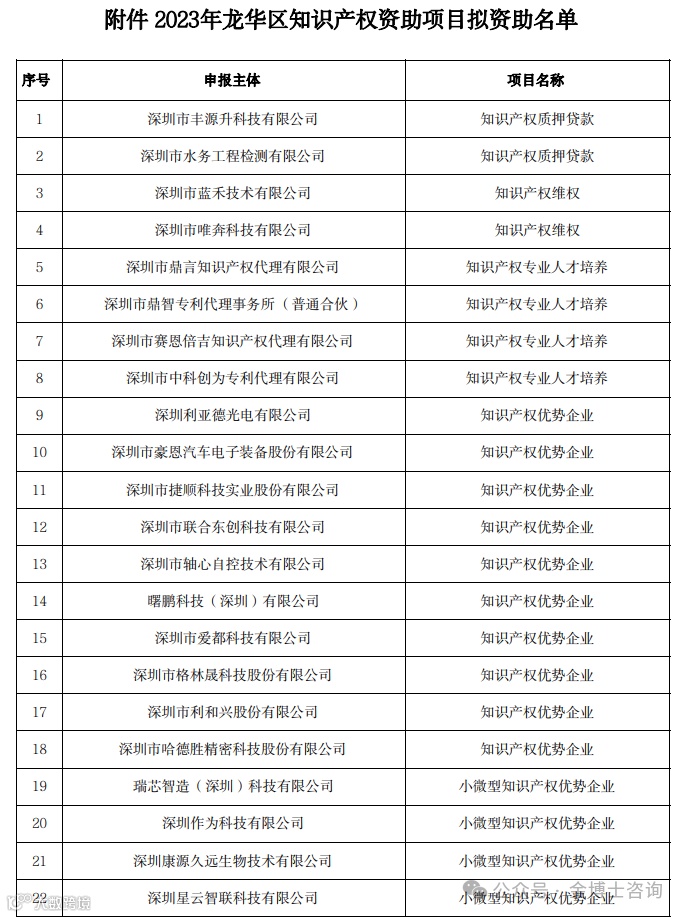 附件:2023年龙华区知识产权资助项目拟资助名单
