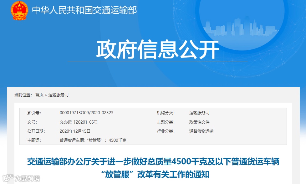 12月15日,交通运输部印发了《关于进一步做好总质量4500千克及以下普通货运车辆“放管服”改革有关工作的通知》(简称《通知》),落实了有关于蓝牌轻卡的一系列政策。