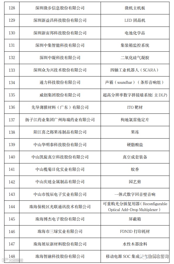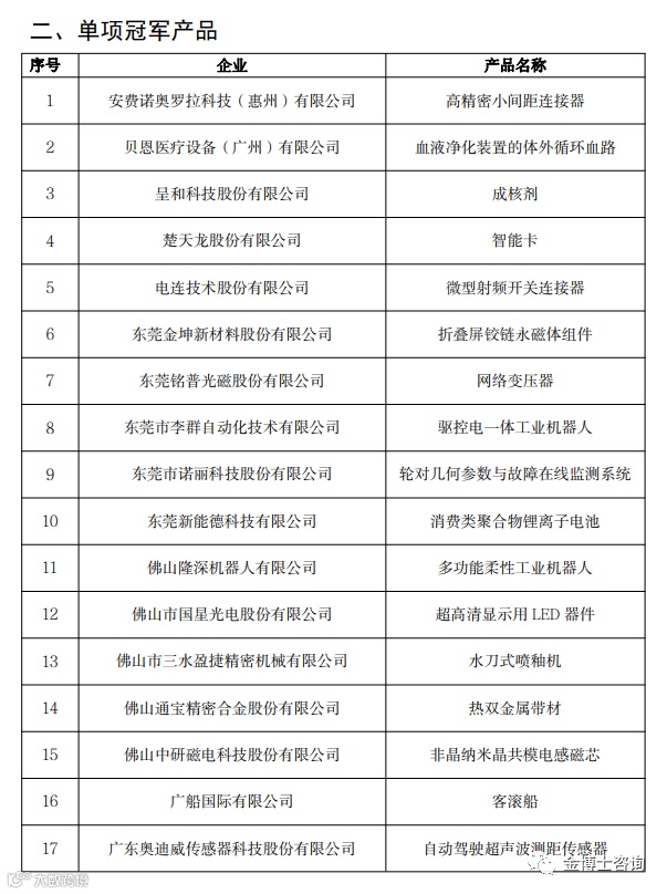 为贯彻落实《广东省工业和信息化厅关于印发〈广东省制造业单项冠军遴选管理办法〉的通知》(粤工信规字〔2022〕5号)和《广东省工业和信息化厅关于开展2022年省级制造业单项冠军企业(产品)培育遴选工作的通知》(粤工信规划政策函〔2022〕41号),广东省工业和信息化厅组织开展了2022年省级制造业单项冠军企业(产品)遴选工作,目前相关审核已完成。现将我省通过审核的企业名单予以公示(详见附件)。