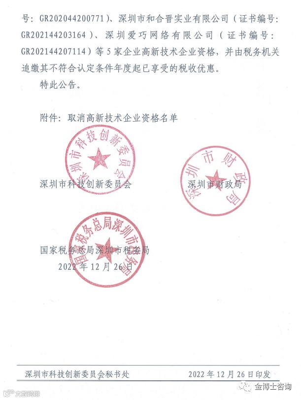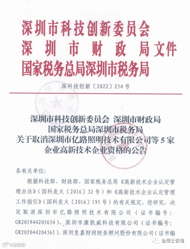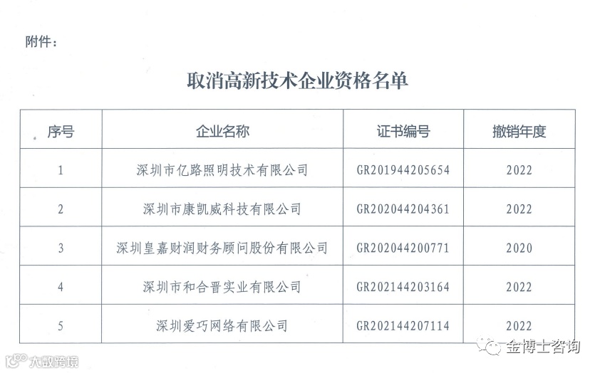 深圳市认定机构:关于取消5家企业高新技术企业资格的公告