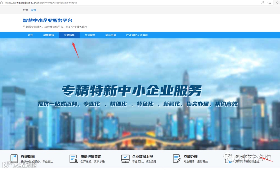 第一步:登录智慧中小企业服务平台(网址:https://szsme.zxqyj.sz.gov.cn/zhzxqyj/home/#/wit-home-page/wit-home,账号密码与广东省政务服务网企业法人或经办人登录账号密码一致);