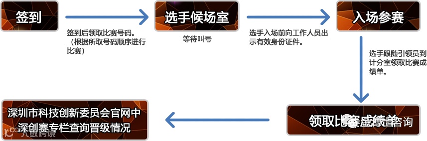 1.根据《第十二届中国深圳创新创业大赛行业决赛赛程安排表》(见附件1),所有入围企业和团队需在规定时间内到场签到(上午签到时间:8:30-9:00,下午签到时间:13:00-13:30,具体场次信息请关注市科创委官网或深创赛公众号),根据签到顺序领取相应比赛号码并在选手等候区等待叫号(根据所取号码顺序进行比赛),逾期未到场签到,视为自动退赛。