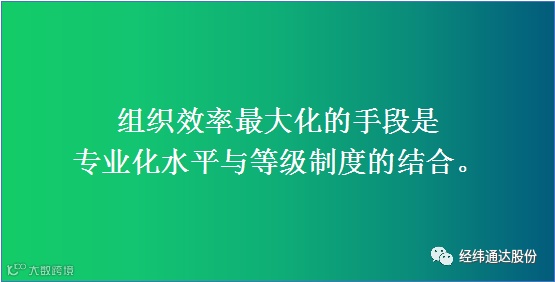一方面我们需要强化专业化的能力,无论是管理者、领导者还是基层人员,只有贡献了专业化的水平,我们才能够算是胜任了管理工作;另一方面需要明确的分责分权制度,只有职责清晰的分工,权力明确的分配,等级安排合理,组织结构有序,管理的效能才会有效地发挥。专业化水平与等级制度的结合正是组织效率最大化的来源。