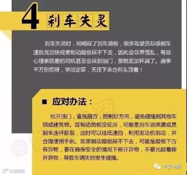 首先,为了预防刹车失灵情况的出现,驾驶员应事先对车辆情况,包括刹车制动、淋水器等装置性能进行检查;