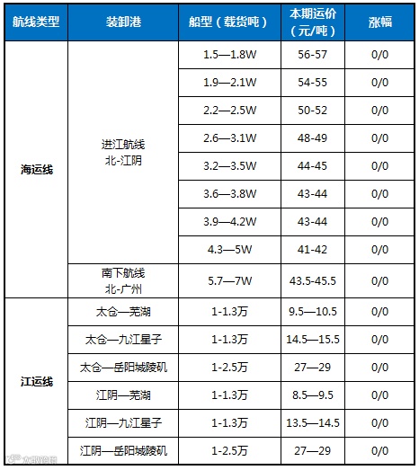 受台风影响部分港口封航,转播周转率受到影响,船东挺价情绪升温,不过目前下游补库需求不高,货船双方僵持不下,今日海运价格维稳;近日长江水位下降、油价上涨,拉运成本增加,船东挺价情绪依旧,但是运价并无明显利好因素,今日江云价格维稳运行。