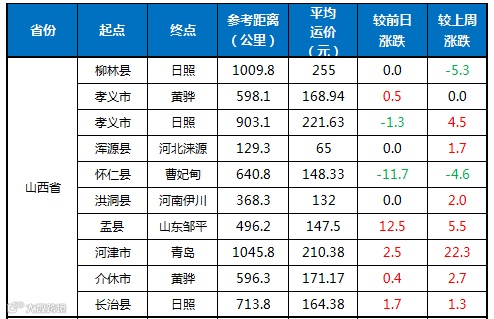 【山西省】周末山西地区部分线路运价上涨1-12元/吨不等。