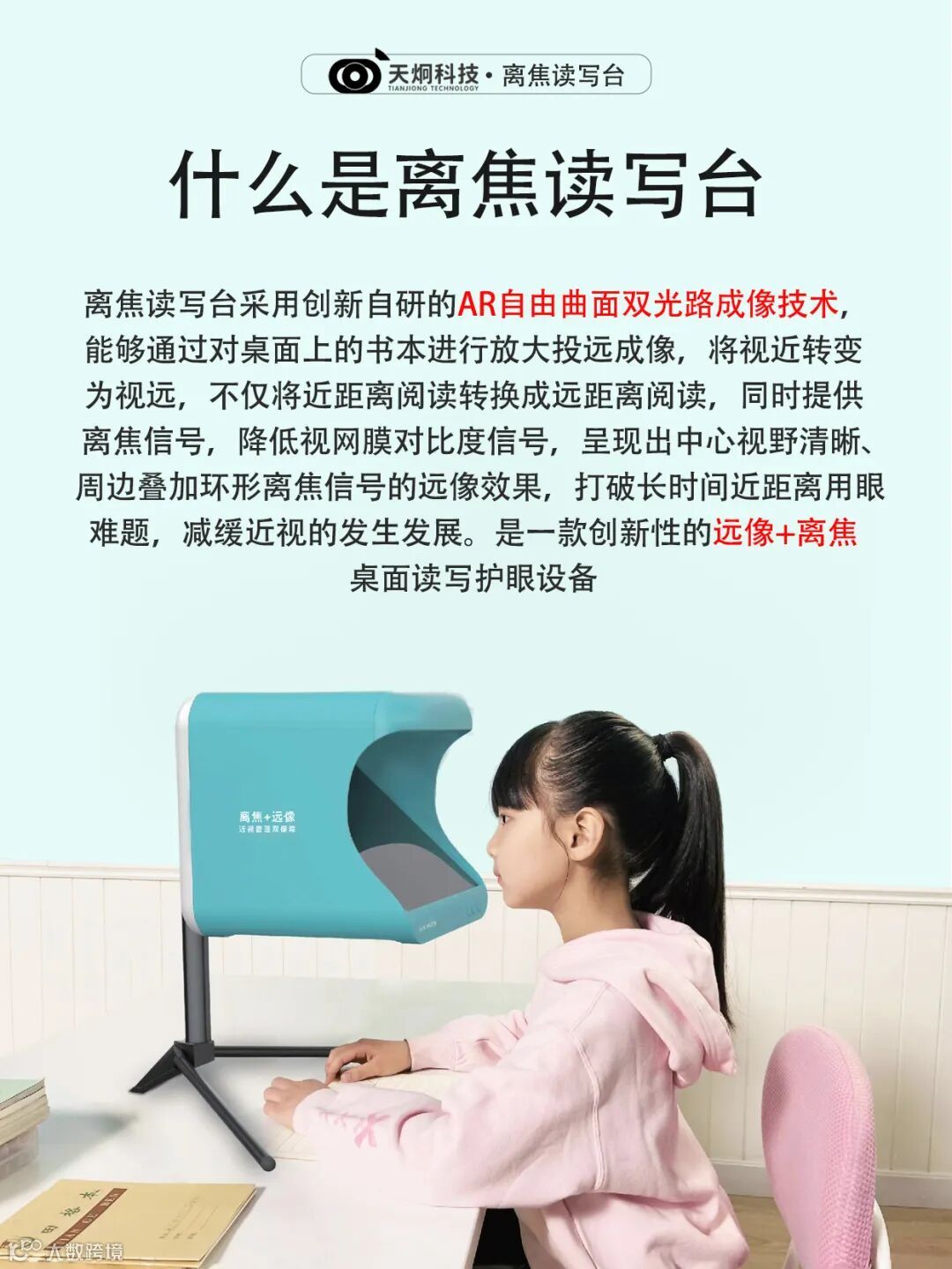 天炯科技·离焦读写台采用AR自由曲面双光路成像技术,不仅将近距离读写用眼转变成远距离用眼,同时提供离焦信号,降低视网膜对比度信号,共同作用延缓近视发生发展,是一款创新型的远像+离焦桌面读写护眼设备,对有效近视管理有着非常重要意义。