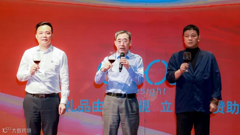 浙江天明控股集团有限公司董事长吴雪峰(左)、杜同和(中)、浙江省眼镜商会会长赵晓军(右)登台祝酒