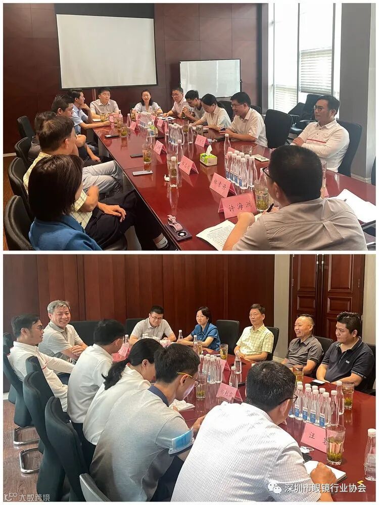 调研组与温州市眼镜商会会长、蓝道集团董事长林加乾、温州市眼镜电商行业协会会长、温州亿家网络管理有限公司董事长林素丹、温州市眼镜商会党支部书记兼常务副会长、温州市冠豪眼镜有限公司董事长郑志远、温州市眼镜商会副会长、温州市朗盛光学有限公司董事林绍豹等企业家就眼镜企业发展经营历程、生产研发技术、品牌运营建设、园区运营等方面内容进行深入探讨。