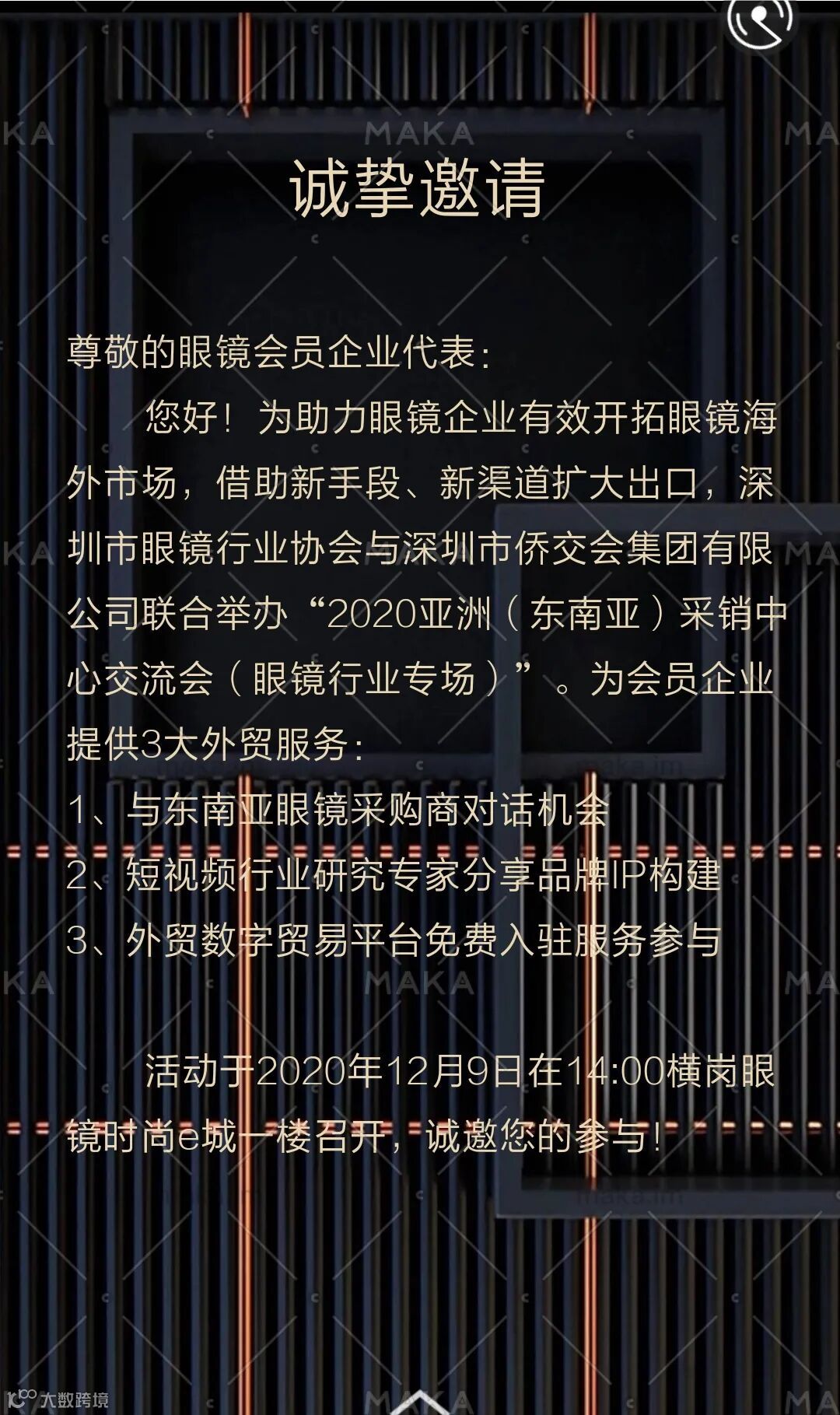 为助力企业有效开拓眼镜海外市场,借助新手段、新渠道扩大出口,深圳市眼镜行业协会与深圳市侨交会集团有限公司将于12月9日下午在时尚e城联合举办“2020亚洲(东南亚)采销中心交流会(眼镜行业专场)”。为会员企业提供3大外贸服务: