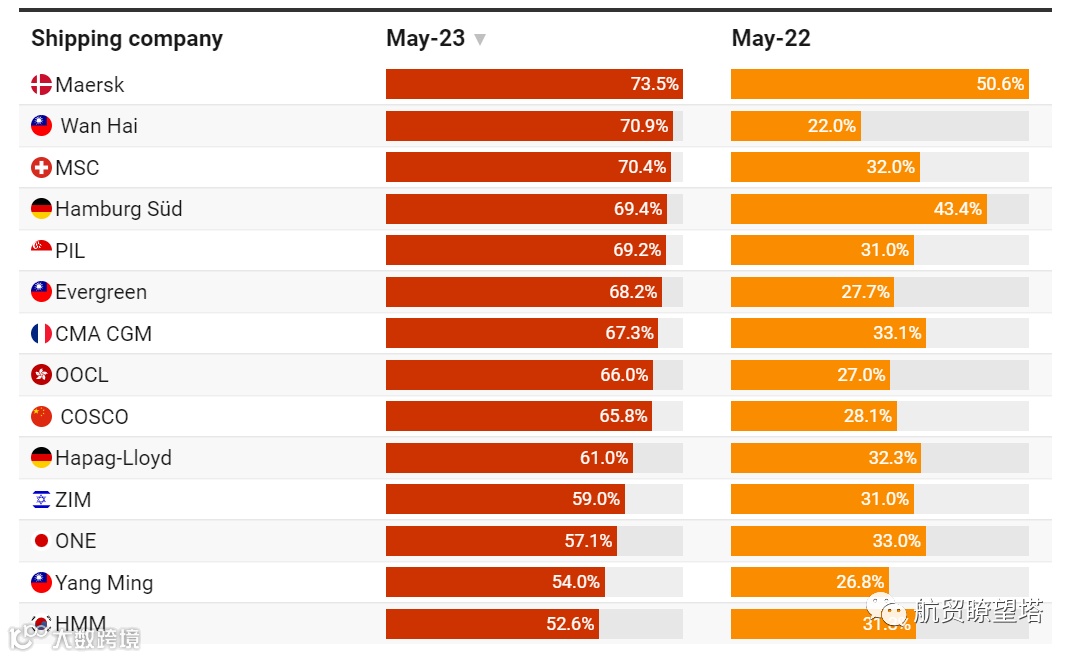 整个行业船期准时率总体上有所改善。2023年5月的平均准时率为66%,而2022年同期为30.3%。虽然这是一个进步,但值得注意的是,33%的客户仍在经历延误现象。