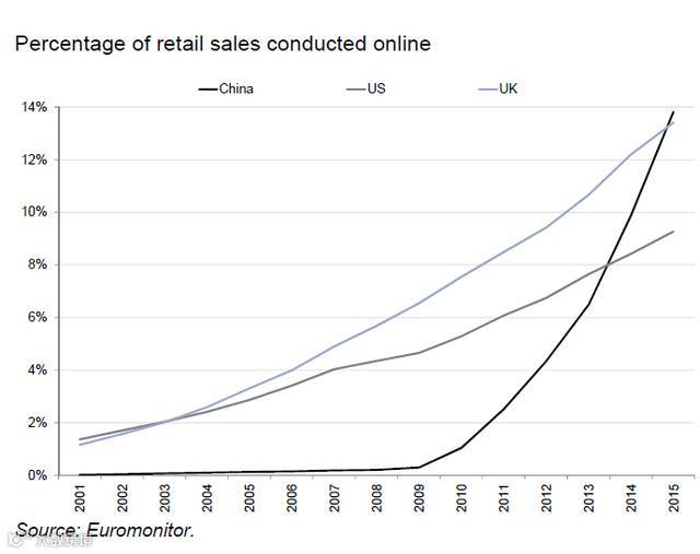 线上购物趋势呈现90°上行。