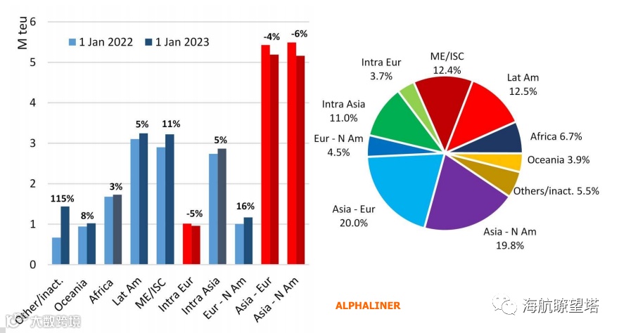 由于前期中国货物需求疲软和海运即期运费下降,导致全球集装箱船队部署的重大变化。2022年超过565000TEU的运力从亚洲--北美航线以及亚洲--欧洲航线撤出。由于赫伯罗特船公司关闭其中国--德国快速航线服务,并在有利可图的跨大西洋航线重新部署运力,上述趋势仍然持续发生。