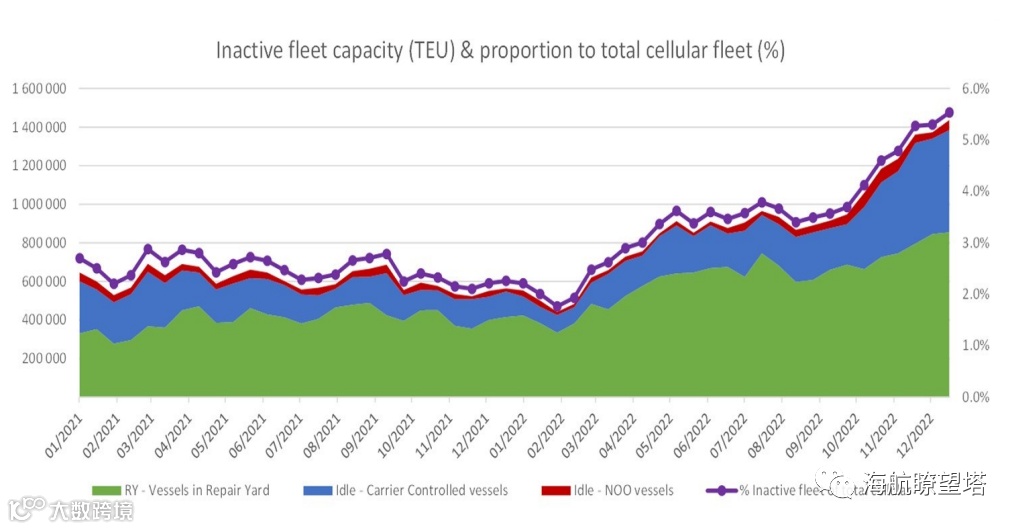 12月中旬,由于闲置的船舶吨位和正在维修的船舶运力有所增加,全球非活跃船队的运力再次增加,达到集装箱船队总运力的5.5%。