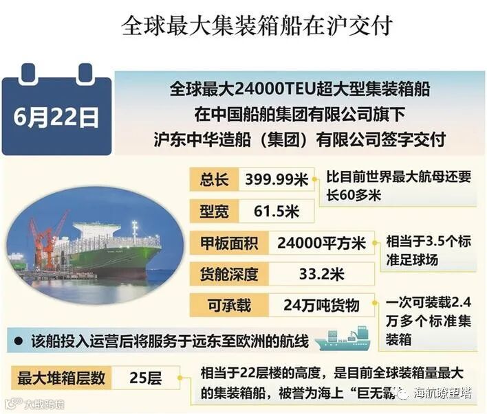 6月22日,中国首艘全球最大24000TEU超大型集装箱船在中国船舶集团有限公司旗下沪东中华造船(集团)有限公司签字交付。这是沪东中华自2020年9月完工交付中国首创全球首艘23000TEU双燃料动力超大型集装箱船,在顶级超大型集装箱船建造领域取得的又一重大突破,该公司由此成为全球屈指可数的全系列集装箱船研发设计建造领军船企,彰显了中国船舶科技突破新跨越、中国创造新高度的先发优势,同时,也创造了中国船舶工业新的里程碑。