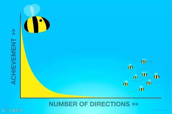 事实上,方向的数量与我们可以取得成就在某种程度上成反比。按照上面的这个公式,每多一个方向将会使你所能达成的成果降到1/4。