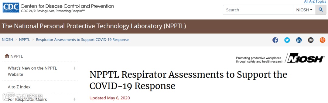 5月6日,美国CDC发布了一则名为《NPPTL Respirator Assessments to Support the COVID-19 Response》关于口罩检测结果的通告。