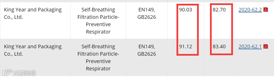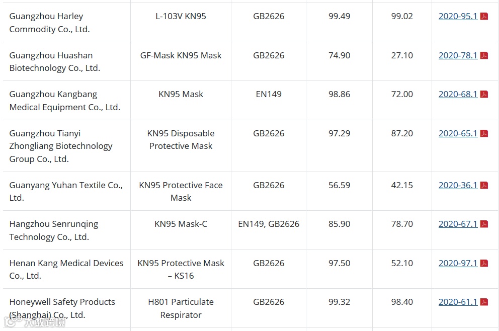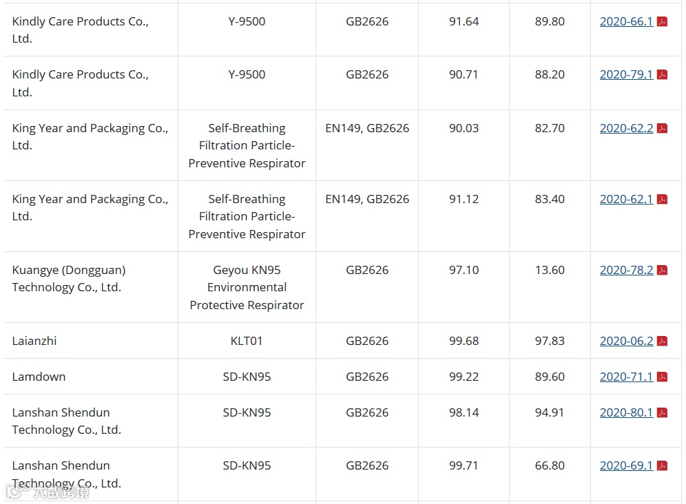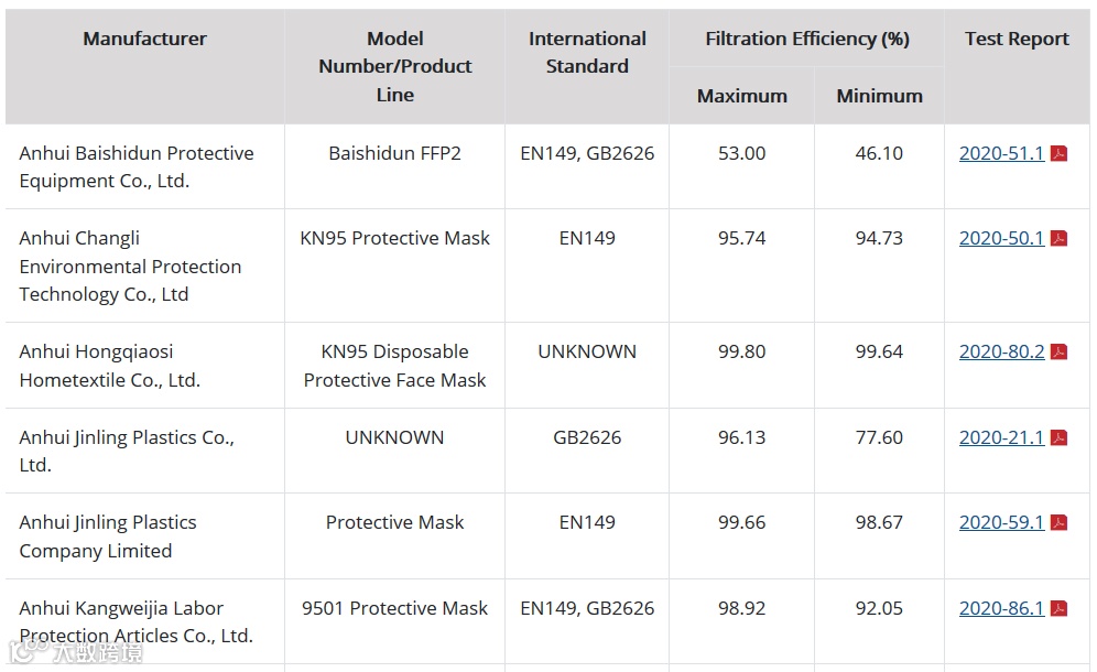 此前,美国疾控中心CDC公布的口罩抽样检测结果中就包含该公司的产品,均未达标(标准线:95%):