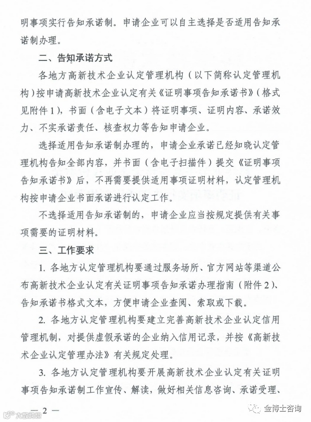 3. 各地方认定管理机构要开展高新技术企业认定有关证明 事项告知承诺制工作宣传、解读,做好相关信息咨询、承诺受理、
