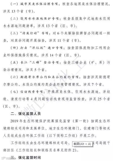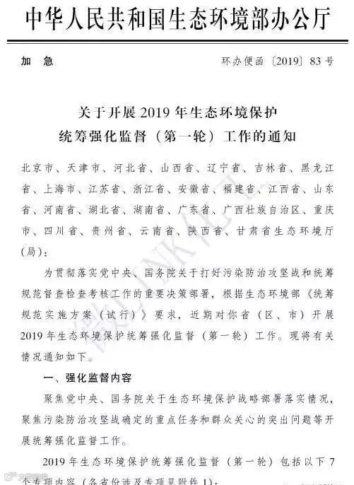 近日,生态环境部办公厅加急印发《关于开展2019年生态环境保护统筹强化监督(第一轮)工作的通知》,文件里涉及全国25个省和直辖市,涉及7个专项内容,并且以加急文件的形式下发各地相关部门。这意味着,新一轮的生态环境督查来了!