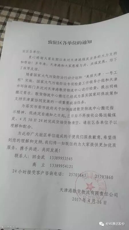 天津港致驻区各单位的通知