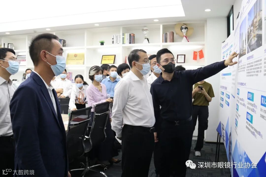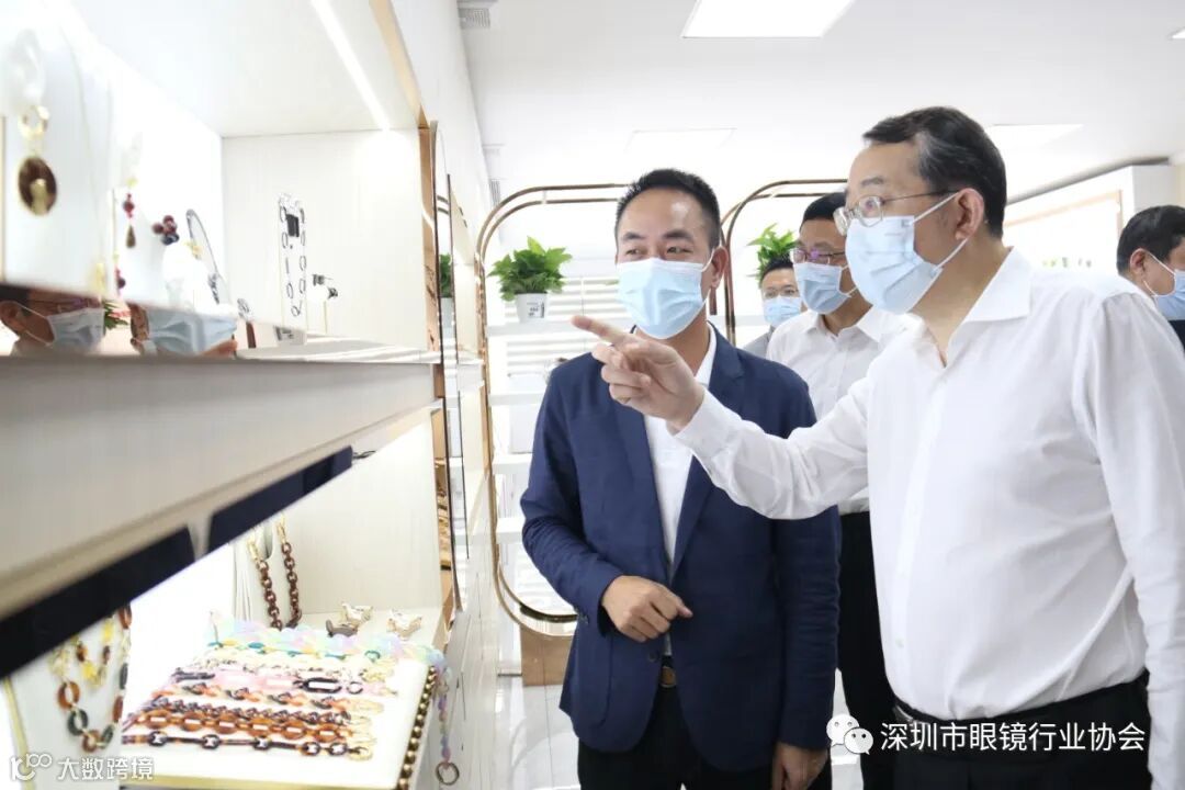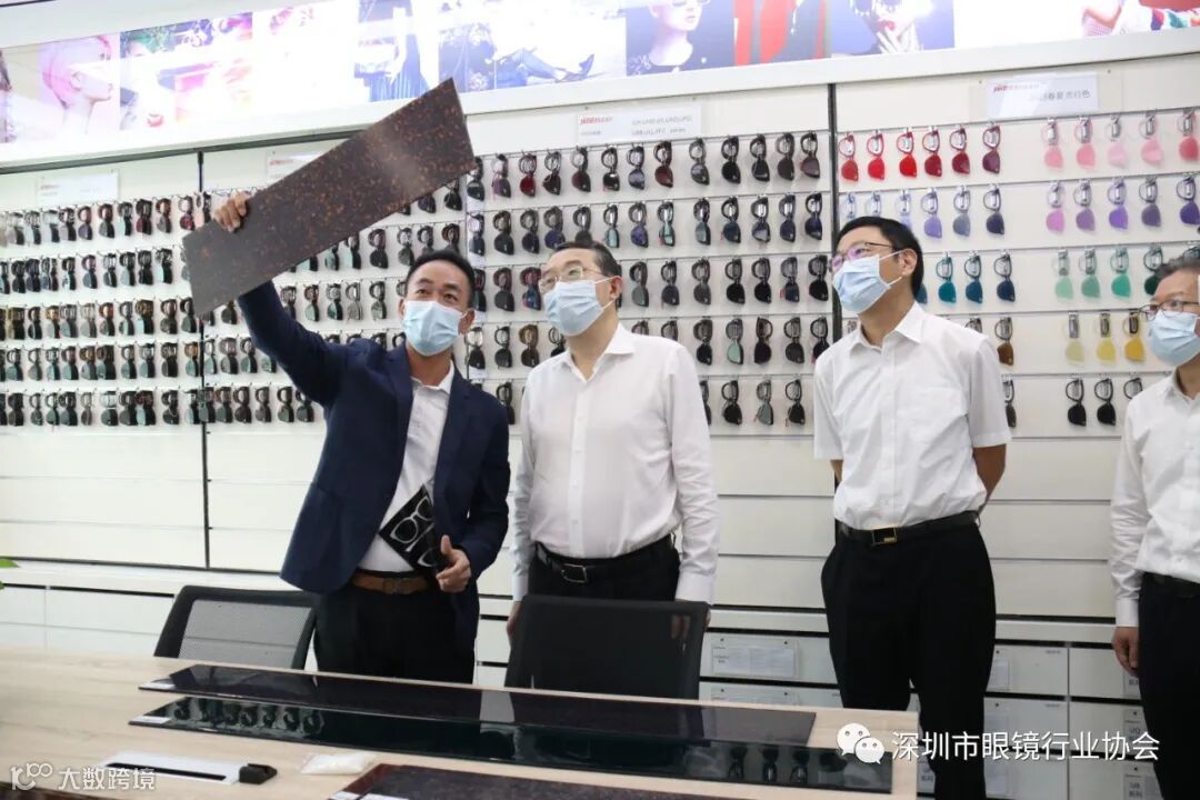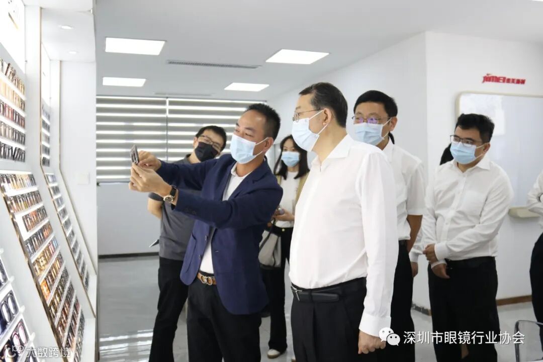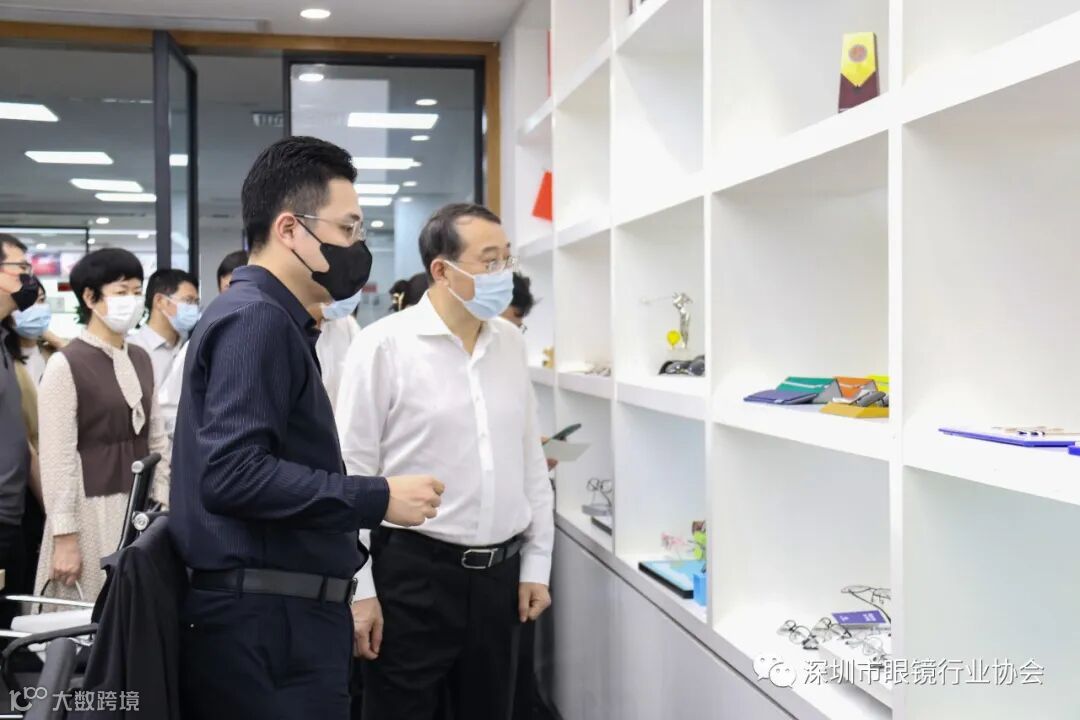 在深圳市眼镜行业协会会长单位集美新材,调研团一行人参观了眼镜板材和成品展区,从工业设计、光学、智能、防疫、时尚饰品等领域全面了解眼镜产业在深圳的发展成果。