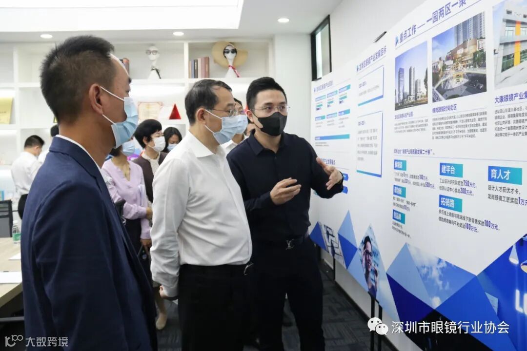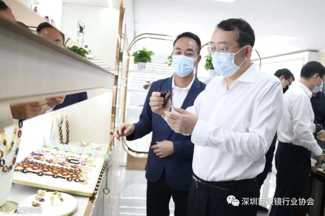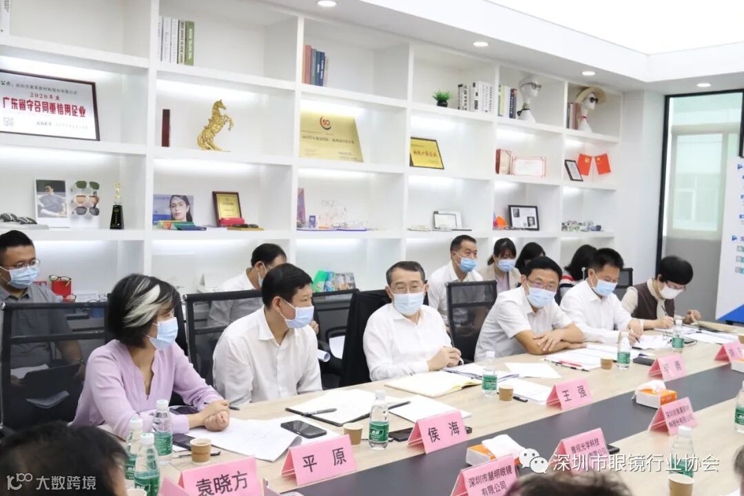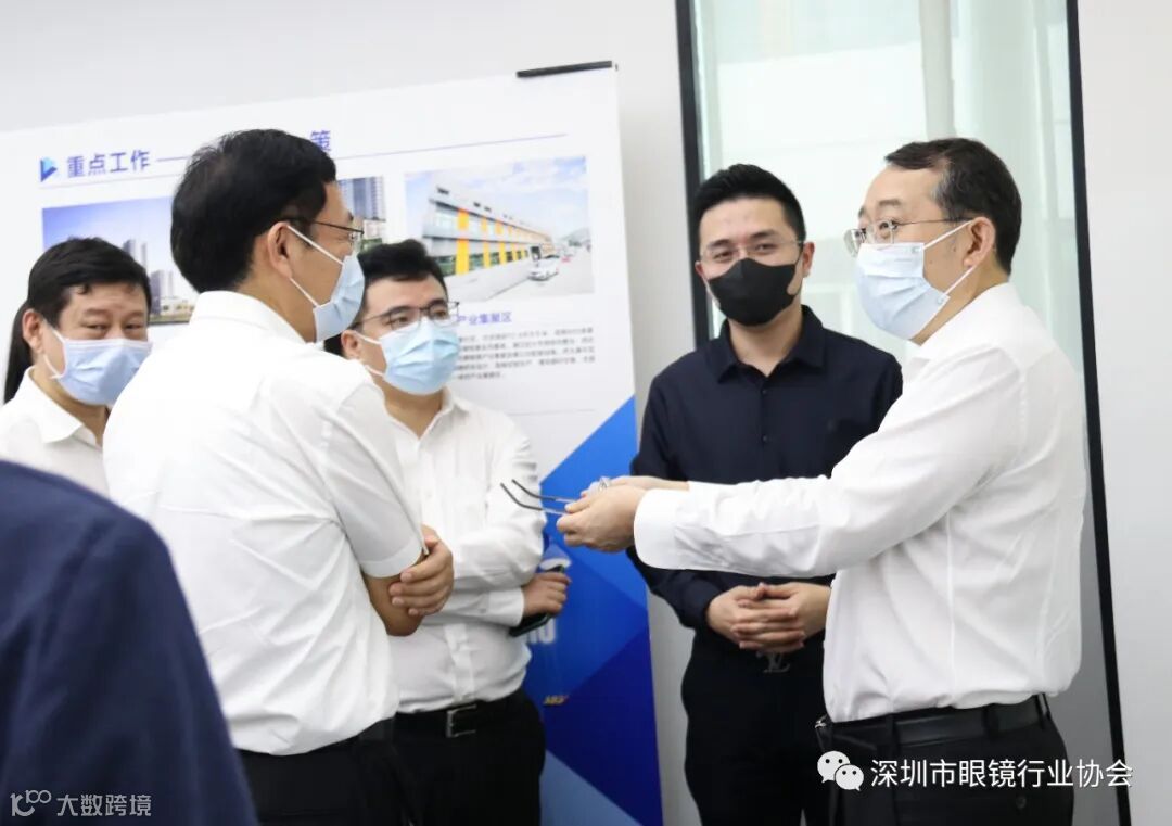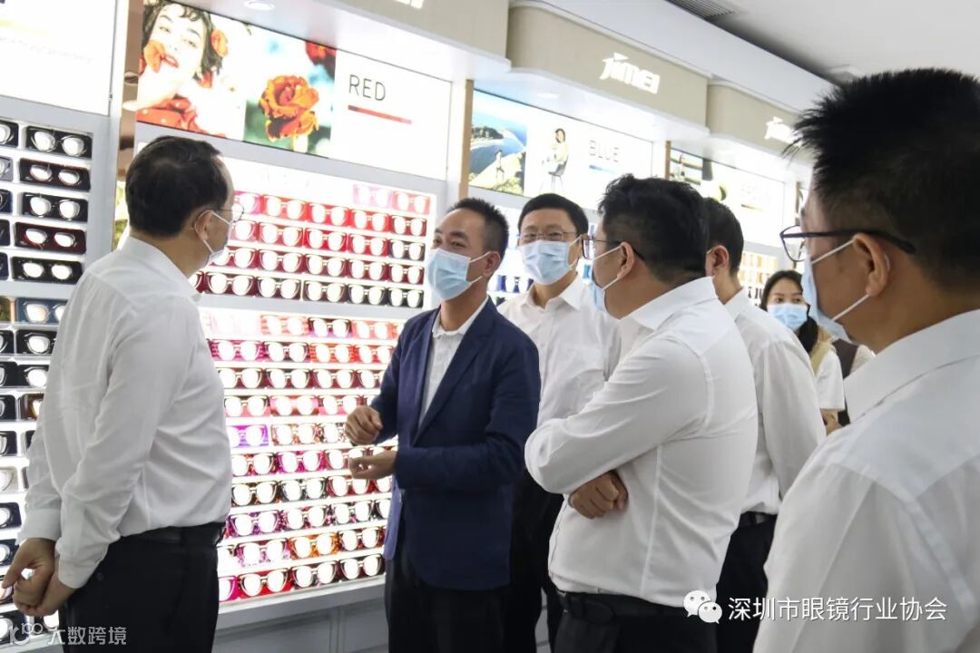 在深圳市眼镜行业协会会长单位集美新材,调研团一行人参观了眼镜板材和成品展区,从工业设计、光学、智能、防疫、时尚饰品等领域全面了解眼镜产业在深圳的发展成果。